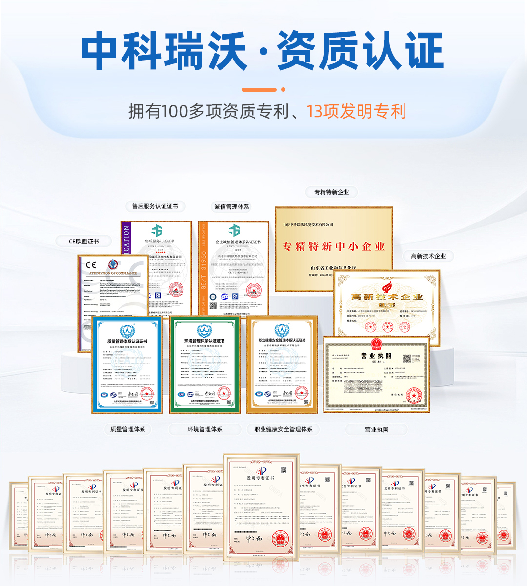 中科瑞沃堅持科技創(chuàng)新,科技研發(fā)實力強,有一支具備豐富一線經(jīng)驗的研發(fā)技術團隊,近年來通過100多項國家實用新型及外觀設計專利;公司生產(chǎn)基地具備《消毒產(chǎn)品生產(chǎn)企業(yè)衛(wèi)生許可證》,產(chǎn)品均在全國消毒產(chǎn)品網(wǎng)上備案信息服務平臺備案,而且都經(jīng)過了第三方正規(guī)檢驗機構的檢測及歐盟CE認證,符合國家標準及國際標準,通過了ISO質量體系、環(huán)境管理體系、職業(yè)健康安全體系等多項認證。體現(xiàn)了公司在生產(chǎn)、管理、銷售和服務等各個環(huán)節(jié)規(guī)范化和體系化。并在2024年通過了國家高新技術企業(yè)認證,這標志著公司在研發(fā)和創(chuàng)新方面得到國家相關部門的肯定與認可。